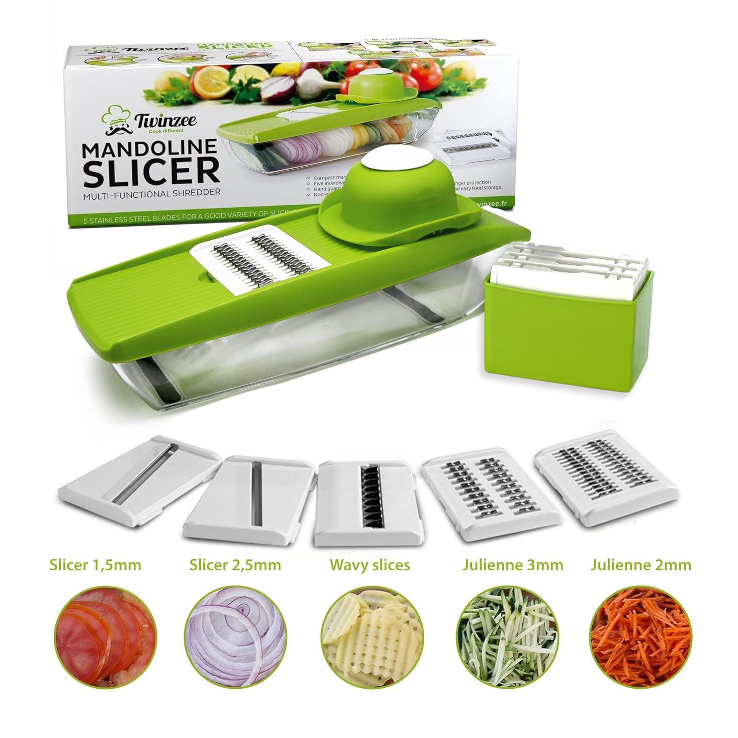 【フランス】 【キッチングッズ】Mandoline電気がいらないキッチングッズが欲しい人に【AMAZON FRANCE】Mandoline de Cuisine Professionnelle 5 en 1 Twinzee - Decoupe les fruits et les legumes rapidement et uniformement - Livre avec 5 lames differentes en inox haute qualite, un poussoir de securite et un bac de stockage